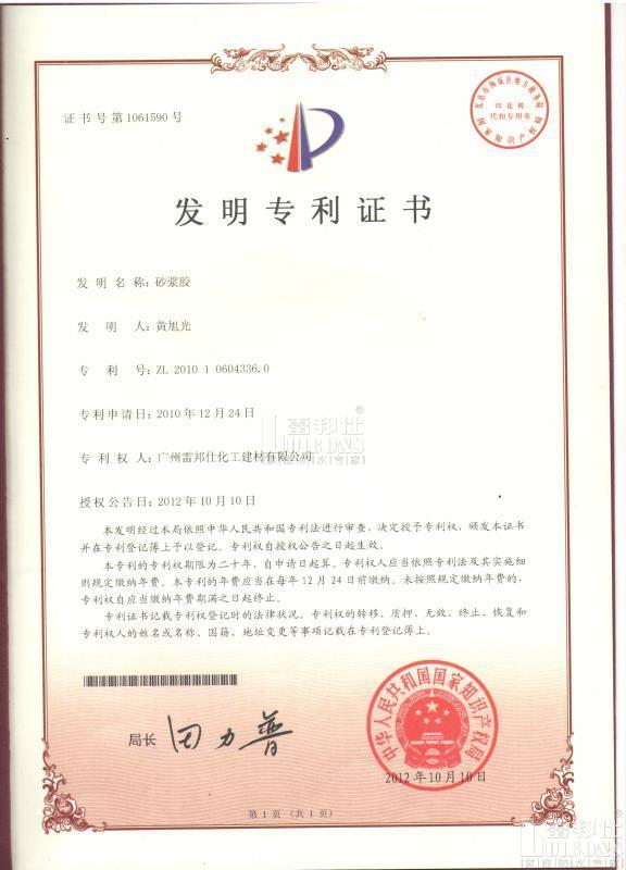 近日,雷邦仕提交的專利發明申請——一種瓷磚粘貼抗脫落增強劑(瓷磚背膠),已正式經過認證審批。讓我們走近專利,感受匠心: