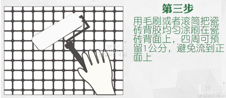 瓷磚背膠:單組份瓷磚背膠,開桶即可使用,先用刷子把背膠刷在瓷磚背面,等涂膜變為透明狀后抹上水泥砂漿或瓷磚膠鋪貼即可。